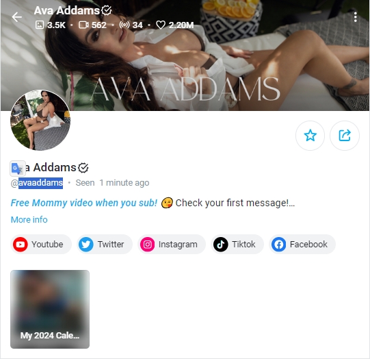 एवा एडम्स, एक प्रसिद्ध वयस्क फिल्म अभिनेत्री, का एक OnlyFans खाता है जहाँ वह अपने ग्राहकों के साथ विशेष सामग्री साझा करती है। OnlyFans पर, एवा एडम्स जैसे क्रिएटर आमतौर पर फ़ोटो, वीडियो, लाइव स्ट्रीम और अपने प्रशंसकों के साथ व्यक्तिगत बातचीत सहित विभिन्न प्रकार की सामग्री प्रदान करते हैं।