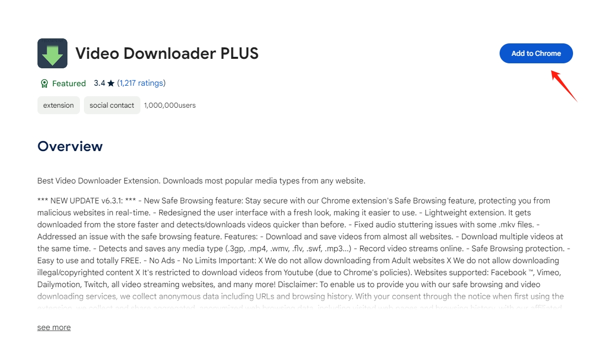 Video Downloader Plus — одно из самых популярных расширений Chrome для загрузки видео, которое позволяет загружать самые популярные типы мультимедиа со многих веб-сайтов. Его использовали 1 000 000 пользователей и получили хорошие отзывы.
