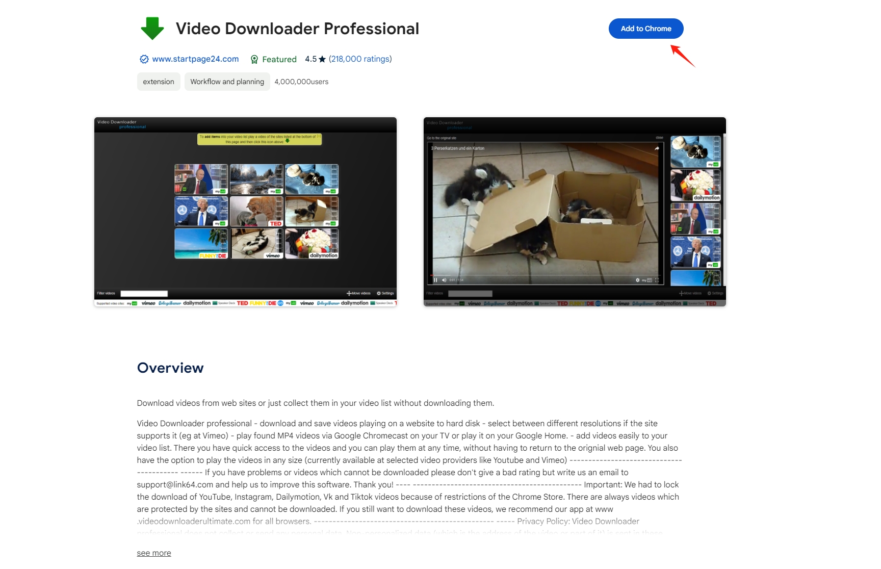 Шаг 1. Перейдите в интернет-магазин Chrome, найдите и установите расширение Video Downloader Professional в свой браузер.